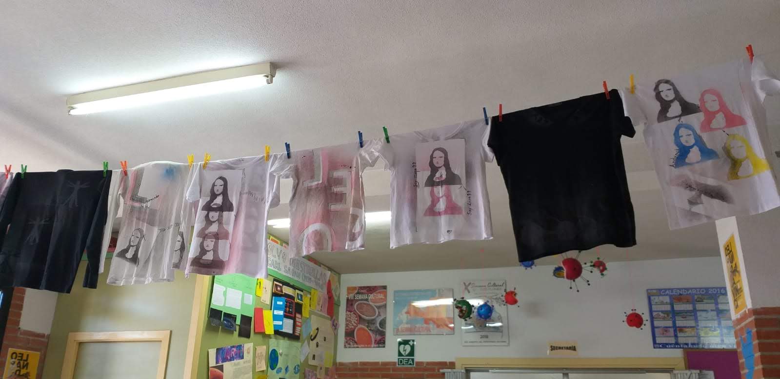 Los alumnos de 2ºESO bilingüe (Sara Fernández, Lucía Almonacid, Alex García, Juan Carlos Villalobos, Sofía Gehrig y todos los alumnos de 1º de Bachiller de Artes diseñaron sus camisetas con Leonardo, usando la técnica de pintura de tela en spray y utilizando plantillas en negativo y positivo.