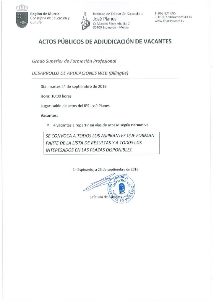 • ACTO DE ADJUDICACIÓN DE VACANTES-GRADO SUPERIOR DAW- 24/09/19