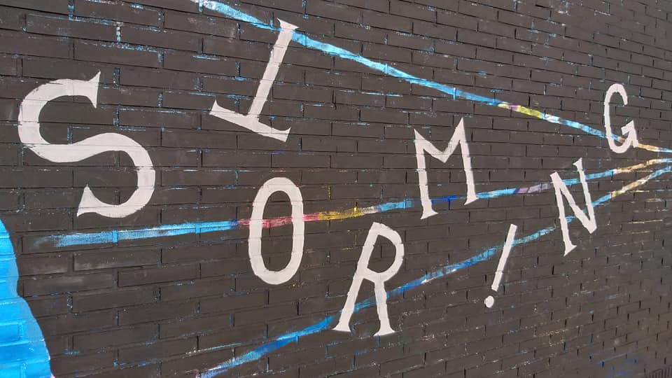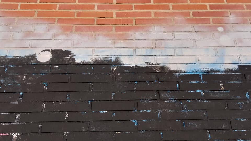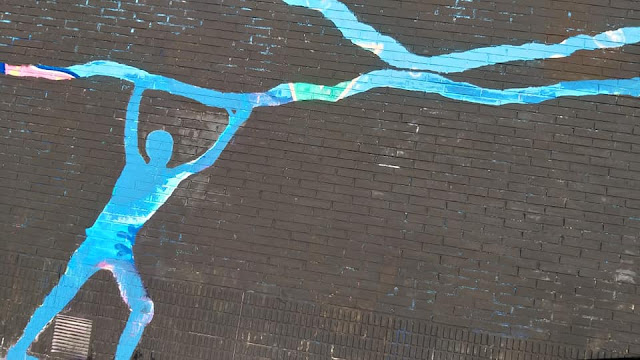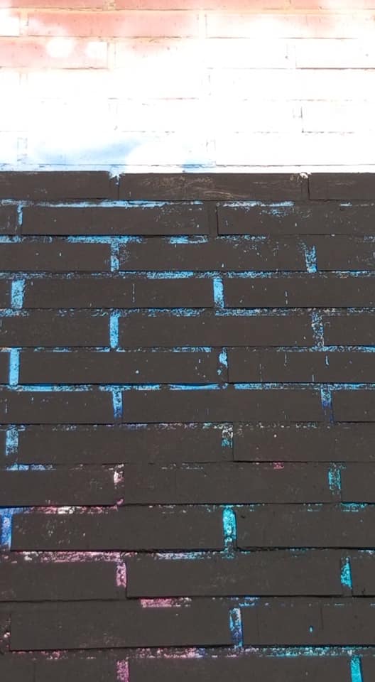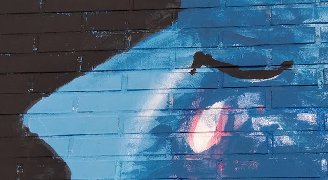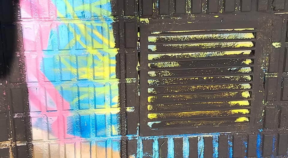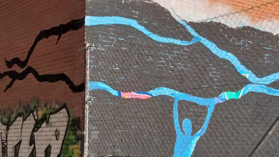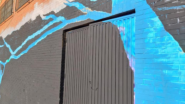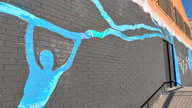 Recordando la terrible imágen de miles de peces saliendo del Mar Menor en busca de oxígeno, el anterior graffiti se ha cubierto con pintura negra en la que asoma el azul del mar en tres siluetas. La primera es el perfil de una cabeza de gran tamaño que sopla con gran fuerza sobre la segunda, un gran árbol que se vence ante la ACCIÓN HUMANA. La tercera silueta, de tamaño natural, es una figura humana que intenta sostener el peso del árbol cuyas ramas caen sobre él.