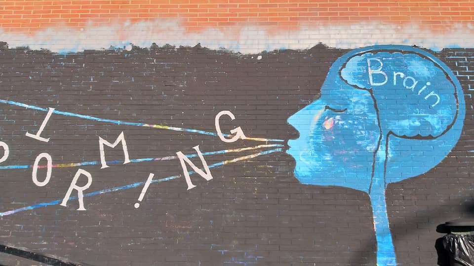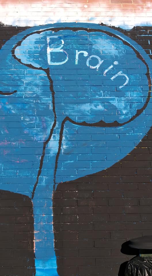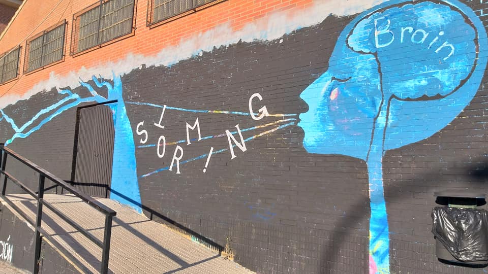 Los alumnos de 2° de Bachiller de Artes han realizado para esta ocasión una PINTURA MURAL en la que se ha reinterpretado el graffiti realizado en el curso 2017-18 en el que peces, y animales marinos decoraban la pared del gimnasio.