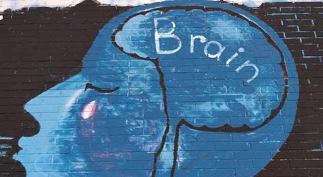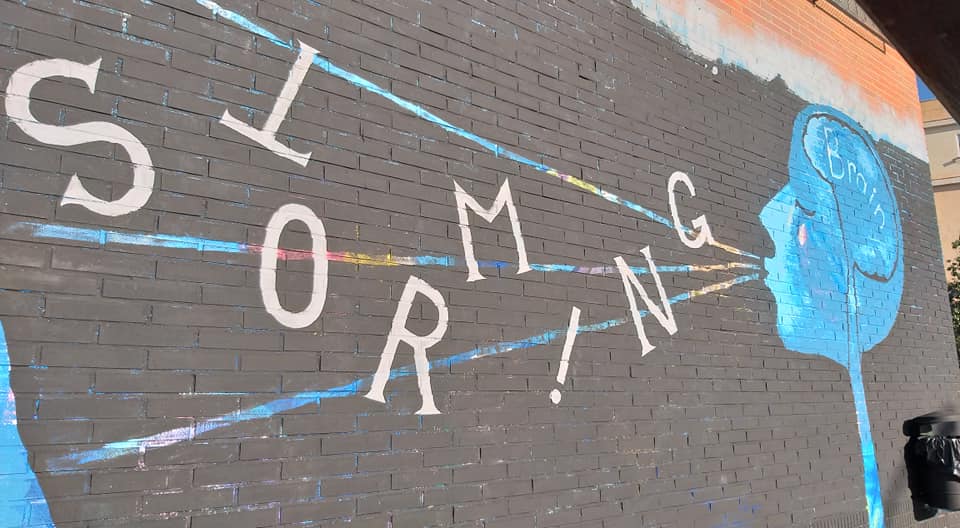Sobre las siluetas, aparece el texto BRAIN sobre el cerebro de la cabeza que sopla, y STORMING sobre el aire que empuja el árbol, haciendo un guiño al recurso creativo de «tormenta de ideas».