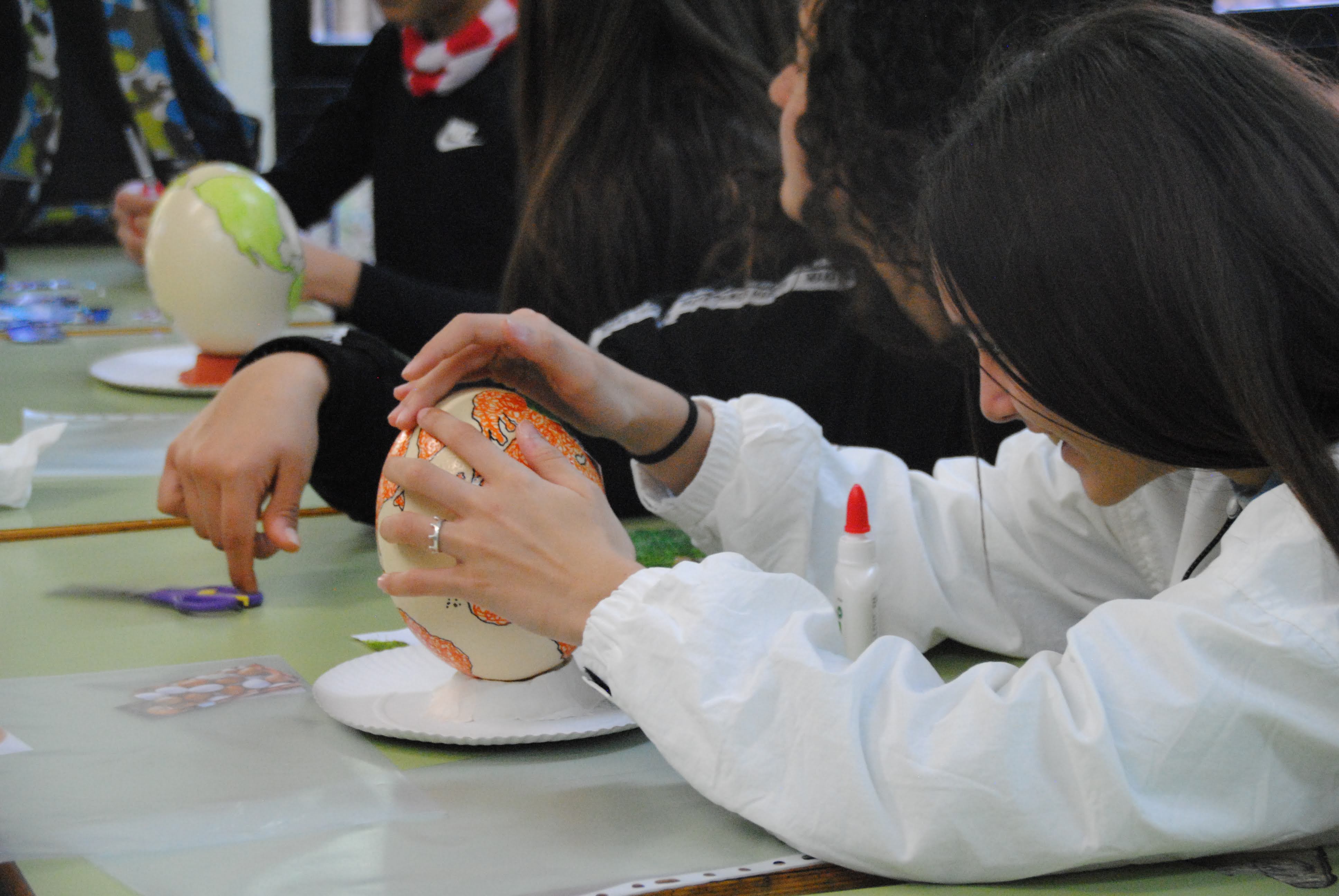 Actividad realizada con los alumnos de 1º de ESO y que ha consistido en dibujar y colorear los continentes a modo de globo terráqueo sobre 8 HUEVOS de AVESTRUZ.