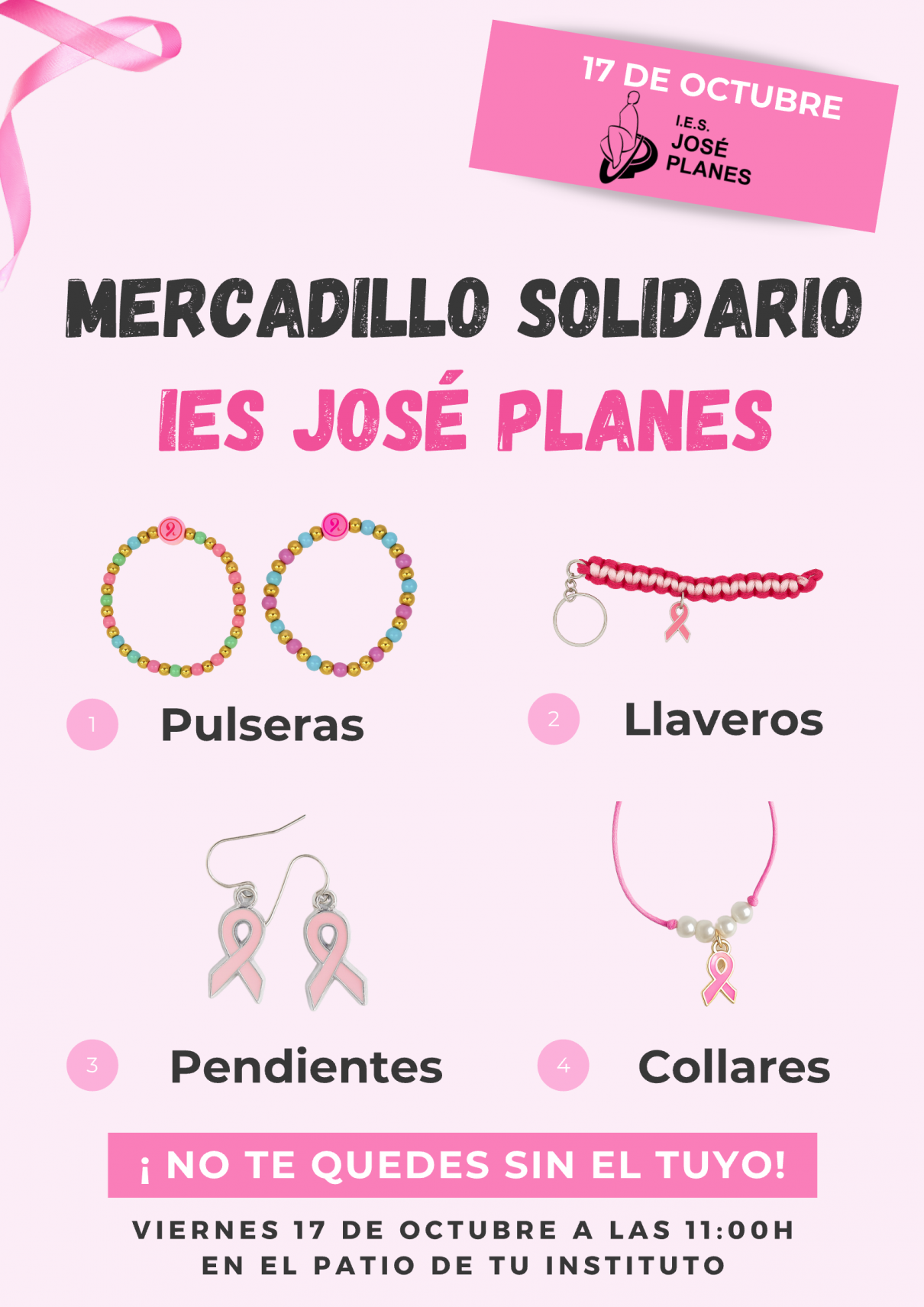 Los alumnos de Atención Educativa del IES José Planes han querido poner su granito de arena en la recaudación de fondos del mercadillo solidario que se celebrará el viernes 17 de octubre, a favor de la lucha contra el cáncer de mama. Han elaborado con mucho cariño pulseras, llaveros, colgantes y pendientes artesanales. ¡No te quedes sin el tuyo y colabora por una