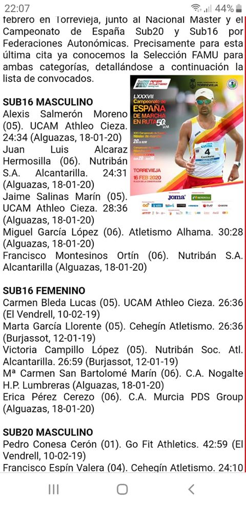 Por otra parte Erica Pérez de 2°C este año ya en ctga sub-16 subia a podium en tercera posición equipos y cuarta posición individual del campeonato de marcha en ruta en distancia de 5 km con un tiempo de 29,02 , marca que le otorgaba plaza para ser seleccionada por la federación de Atletismo de Murcia, FAMU, entre las 5 mejores marchadoras de la Región para disputar el campeonato Nacional de marcha en ruta por Autonomías el próximo 16 de Febrero en Torrevieja.