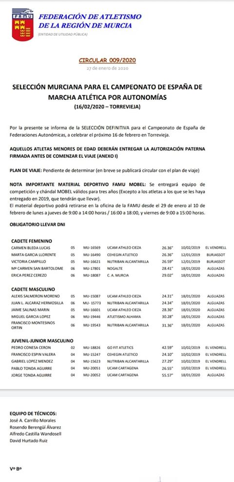 Por otra parte Erica Pérez de 2°C este año ya en ctga sub-16 subia a podium en tercera posición equipos y cuarta posición individual del campeonato de marcha en ruta en distancia de 5 km con un tiempo de 29,02 , marca que le otorgaba plaza para ser seleccionada por la federación de Atletismo de Murcia, FAMU, entre las 5 mejores marchadoras de la Región para disputar el campeonato Nacional de marcha en ruta por Autonomías el próximo 16 de Febrero en Torrevieja.