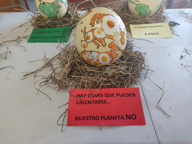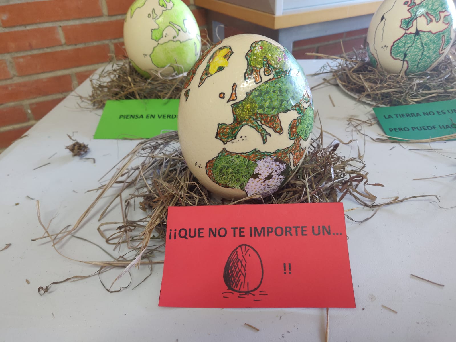 Hacen referencia a los 8 carteles realizados para la #XIISemanaCultural de nuestro centro, dedicada este año al Medio Ambiente y donde el huevo ha sido el hilo conductor por su forma cercana y su fragilidad con nuestro planeta Tierra.