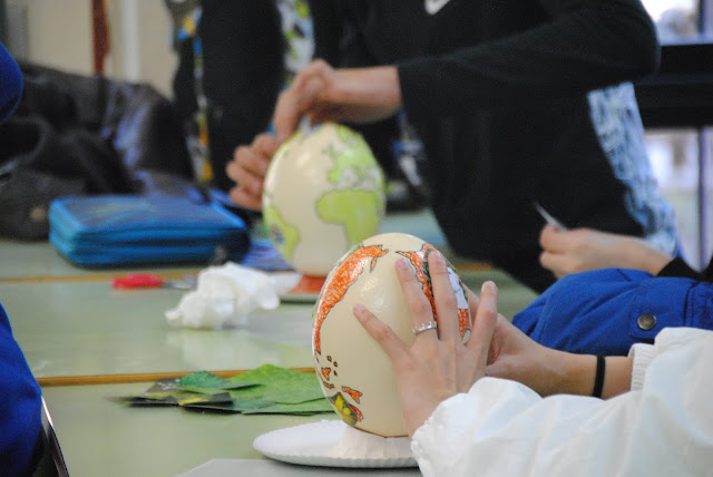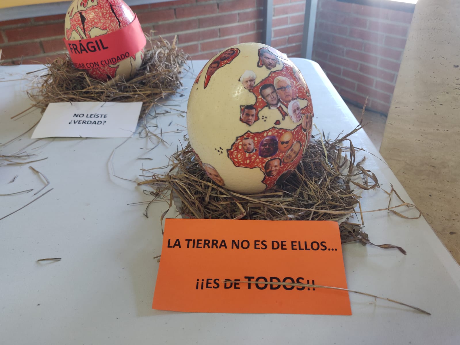 Actividad realizada con los alumnos de 1º de ESO y que ha consistido en dibujar y colorear los continentes a modo de globo terráqueo sobre 8 HUEVOS de AVESTRUZ.